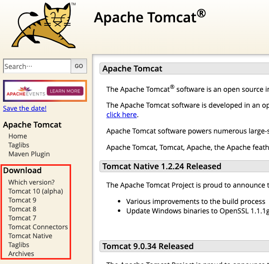 톰캣은 공식 홈페이지에서 쉽게 다운받을 수 있다.