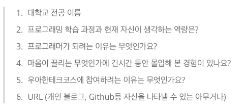 가장 먼저 해야될 것은 지원서를 작성하는 것이었는데, 출신(학력)같은 것은 전혀 쓰지 않고 자소서 형태로 되어있었다.