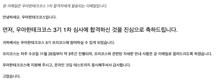 다행히도 자소서와 코테 모두 기준점 이상이 나왔는지 합격 메일을 받아볼 수 있었다.